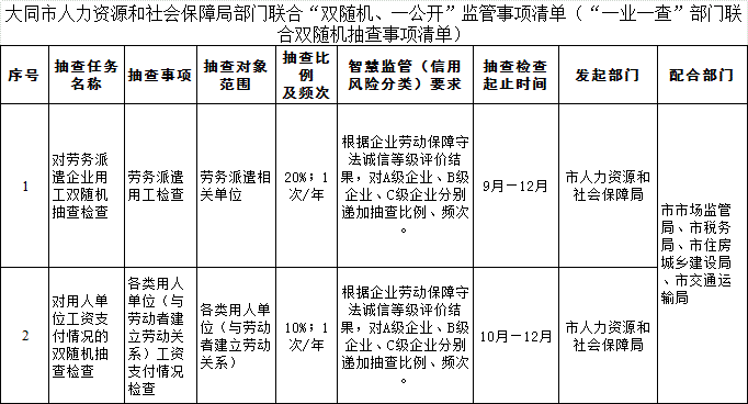 大同市人力資源和社會保障局部門聯合“雙隨機、一公開”監管事項清單